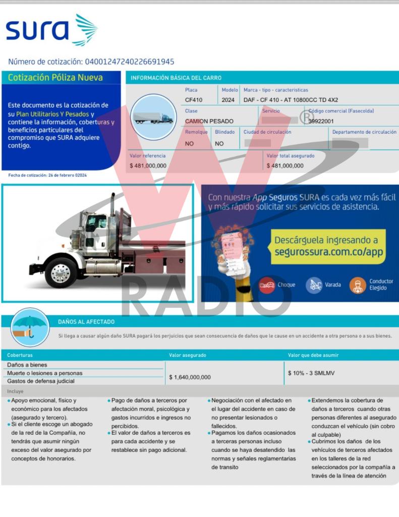 Dentro de las irregularidades está el valor de las pólizas de seguros para vehículos de 18 toneladas, en el documento de la UNGRD tiene un precio de $85 millones de pesos por cada carrotanque; Sigue La W consultó el valor oficial con SURA y el costo real para este vehículo doble troque es de $12 millones de pesos con todos los riesgo incluidos.