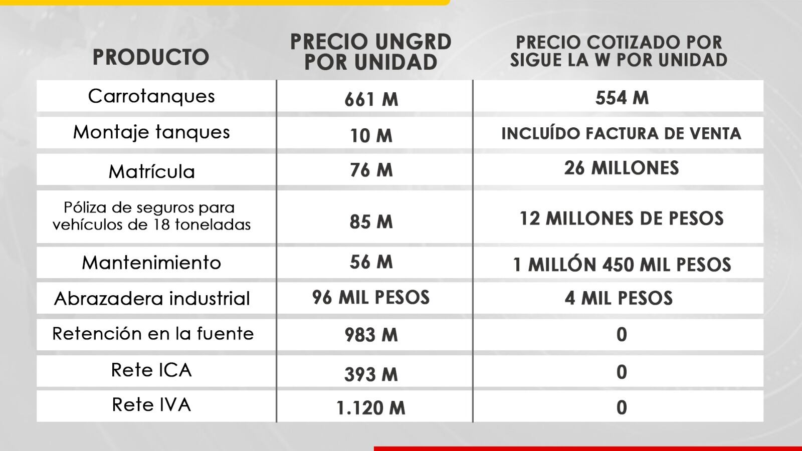 Otro de los valores que genera dudas es el del mantenimiento de los vehículos, teniendo en cuenta que son camiones completamente nuevos, el valor puesto por UNGRD es de $56 millones de pesos, mientras que el precio real conocido por Sigue La W es de $1′450.000 cada uno.