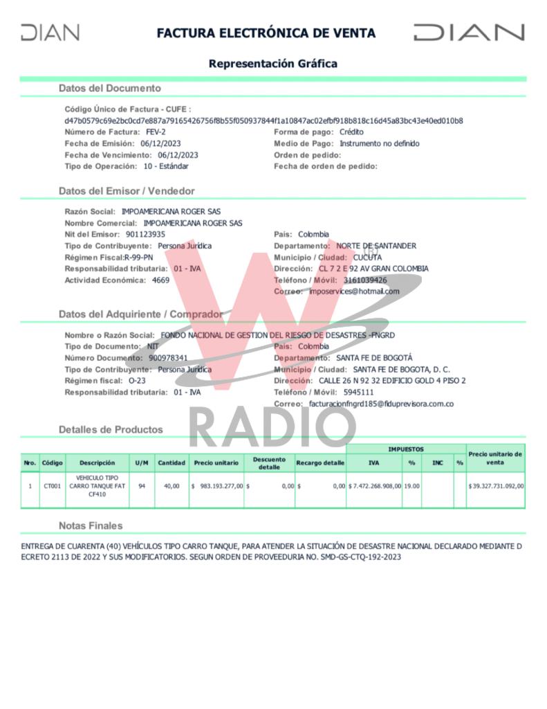 Sigue La W consiguió en exclusiva la factura electrónica de venta real de Impoamericana Roger SAS con el Fondo de Gestión del Riesgo y allí queda claro que todos esos costos adicionales no quedaron incluidos en el proceso de venta oficial, donde solo se incluye la venta de los 40 carrotanques.