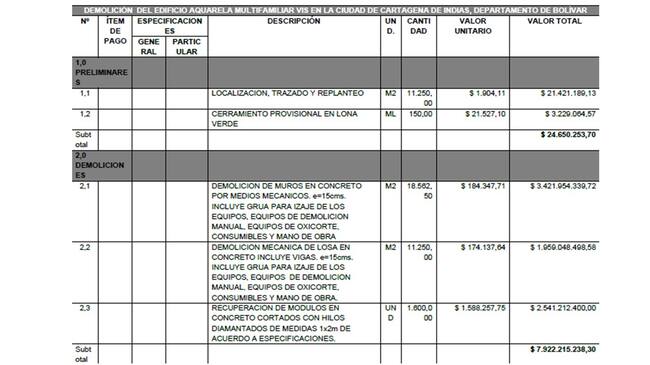 Para la demolición de Aquarela se generó un contrato interadministrativo, bajo la modalidad de contratación directa. El Distrito solicitó propuesta a la Empresa de Desarrollo Urbano de Bolívar – EDURBE.