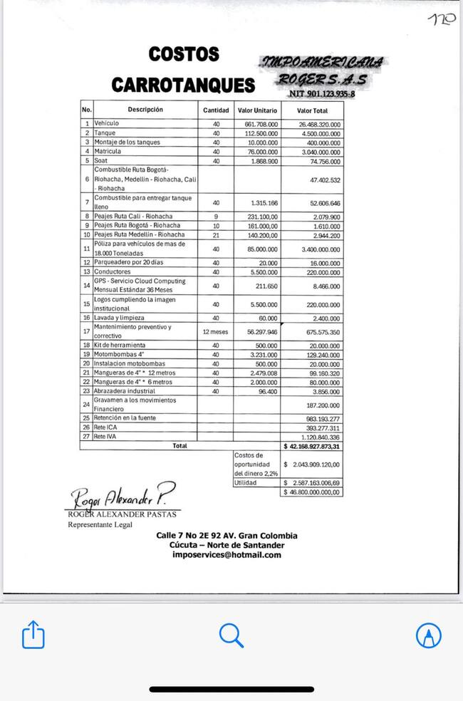 Otro de los puntos que cuestiona el economista es el último Ítem llamado: Costos de oportunidad del dinero, “ese término se refiere a lo que a mí me cuesta dejar de hacer algo, para cumplir con el contrato, como si por vender los carrotanques ellos dejaran de hacer otros negocios”.