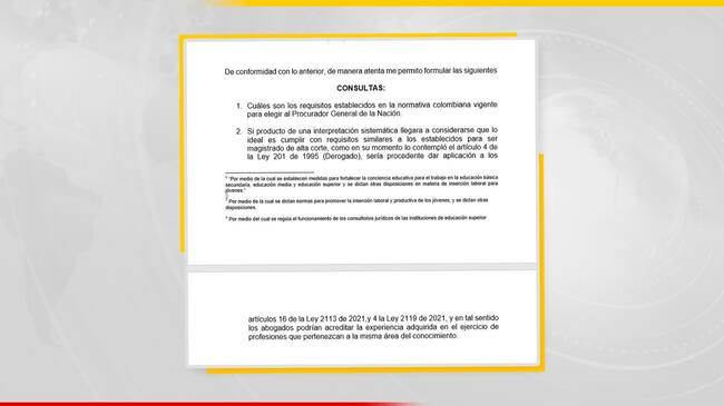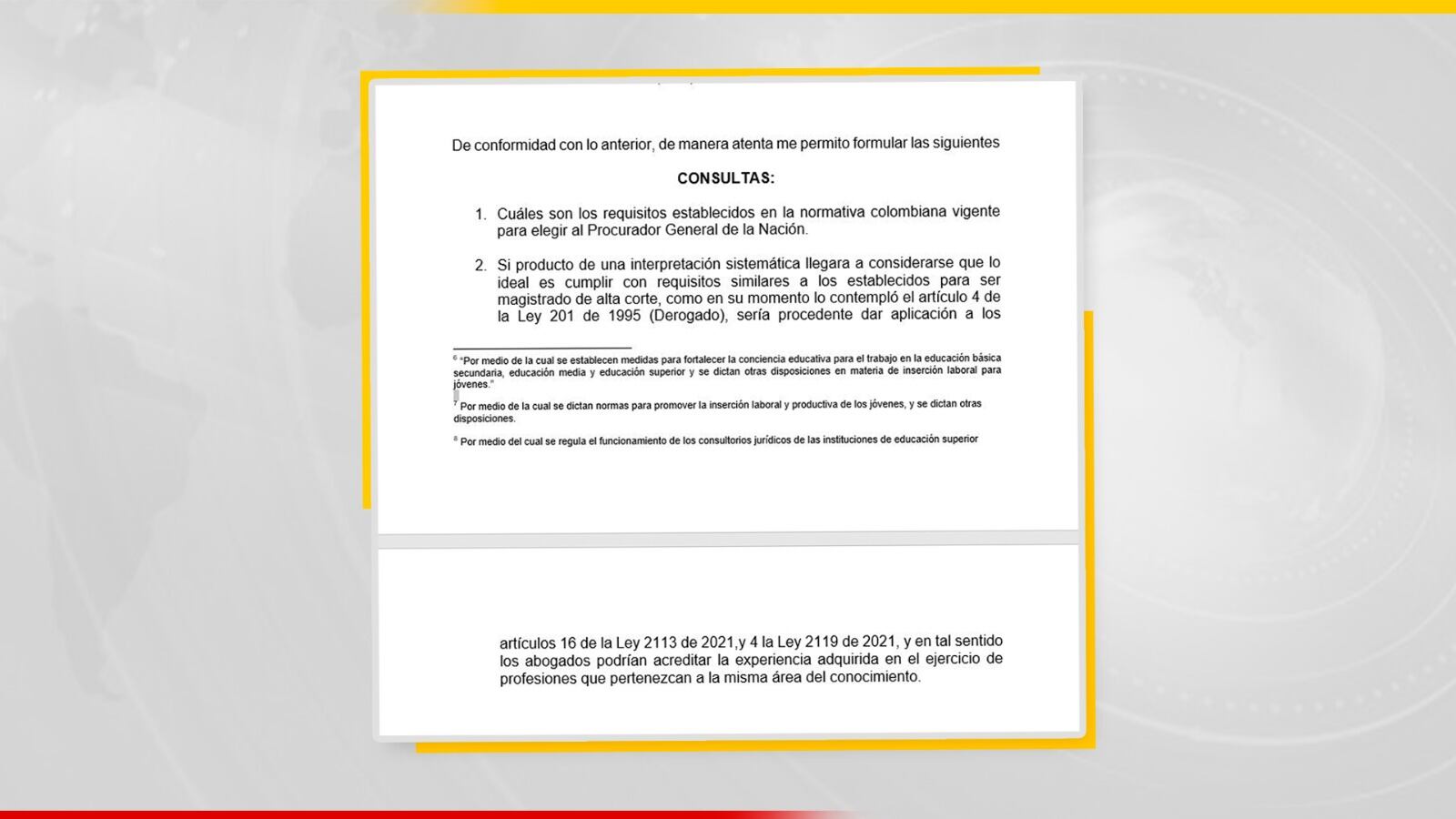 Ahora, según pudo conocer Sigue La W, la Corte Suprema de Justicia emitió una comunicación oficial para solicitar al ministro del Interior, Luis Fernando Velasco, que eleve una consulta al Consejo de Estado para determinar cuál es el perfil o cómo debe ser la hoja de vida de la persona que aspire a ser procurador general de la Nación.