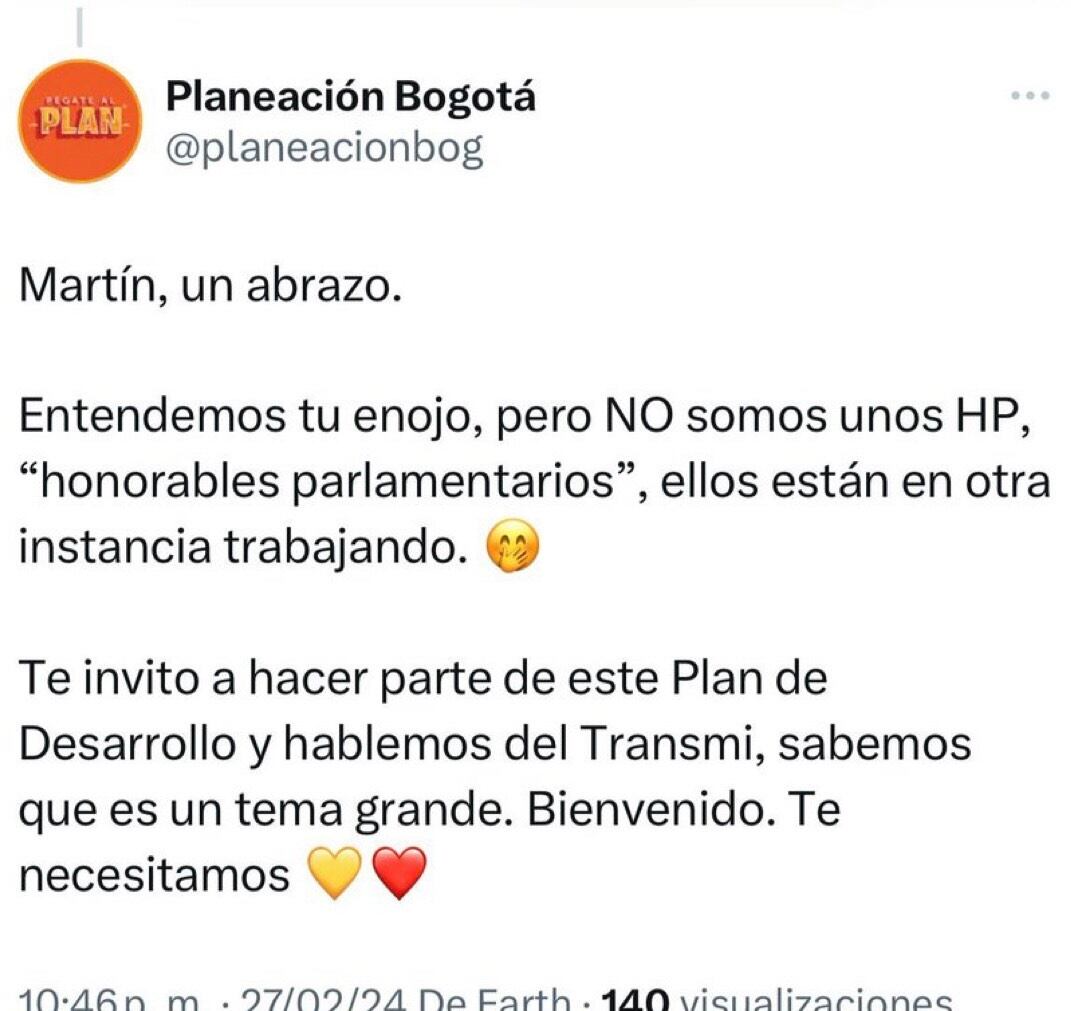En el trino, la Secretaría de Planeación declaró: “Martín, un abrazo. Entendemos tu enojo, pero no somos unos HP, ‘honorables parlamentarios’, ellos están trabajando en otra instancia.” Estas palabras han sido interpretadas de manera diversa, siendo la representante a la cámara Carolina Arbeláez y algunos cabildantes distritales quienes lo consideran un insulto.