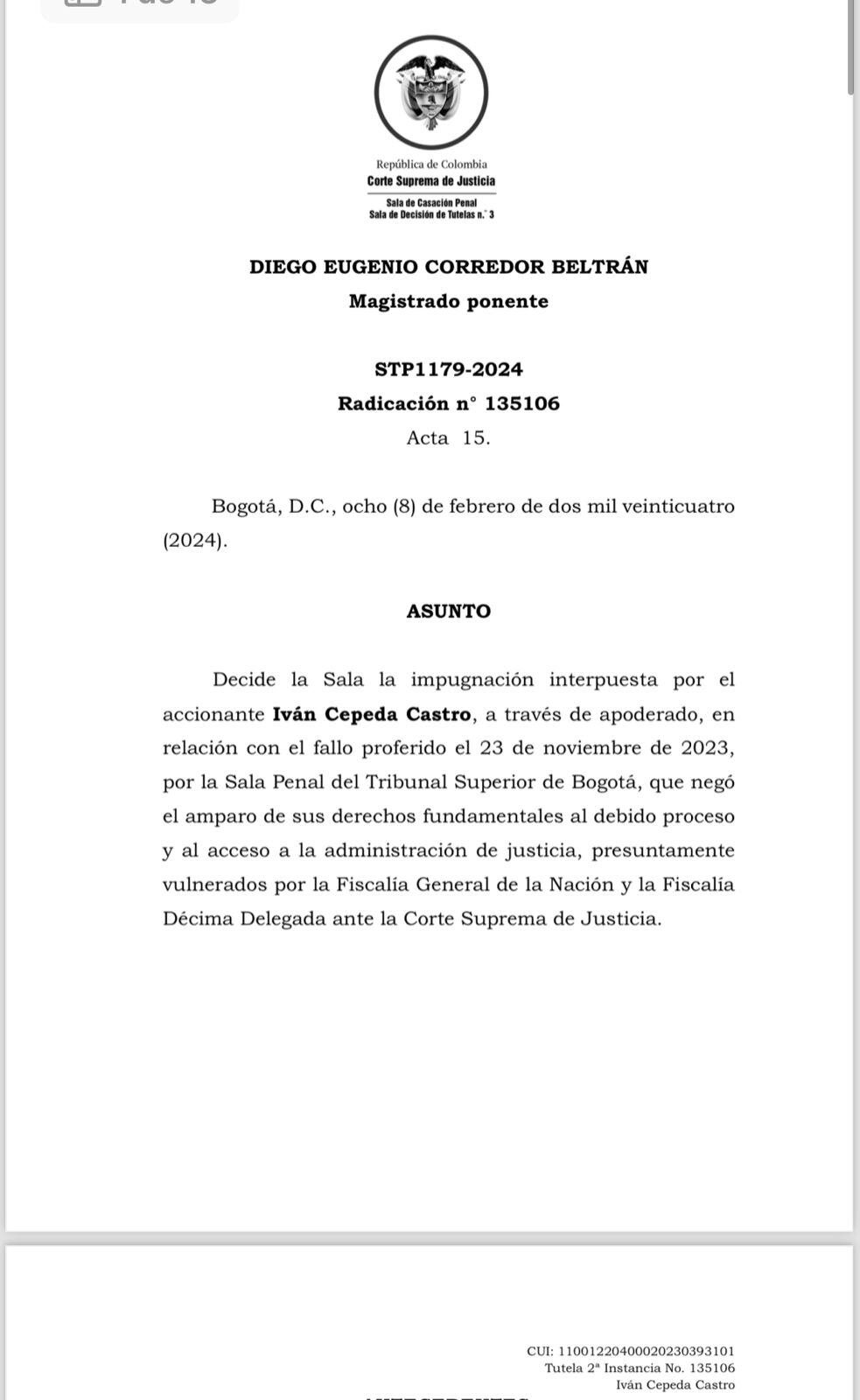 En un documento de 13 páginas, el alto tribunal estudió la impugnación del senador Cepeda en contra del fallo proferido el 23 de noviembre de 2023 por la Sala Penal del Tribunal Superior de Bogotá, que negó el amparo de sus derechos fundamentales al debido proceso y al acceso a la administración de justicia, presuntamente vulnerados por la Fiscalía General de la Nación y la Fiscalía Décima Delegada ante la Corte Suprema de Justicia.