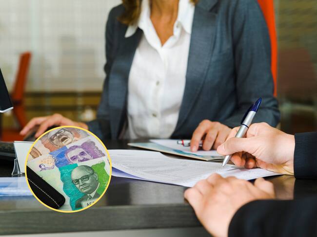 Persona en un banco firmando diferentes papeles para compra de cartera. En el círculo, la imagen de billetes colombianos de diferente denominación (Fotos vía GettyImages)