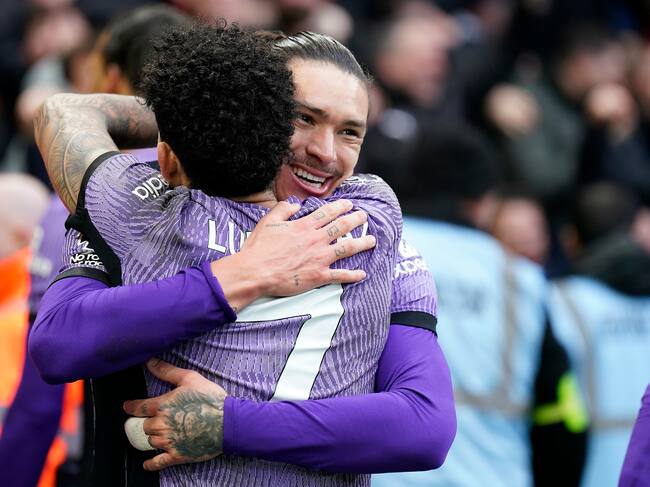 Darwin Núñez abraza a Luis Díaz tras el gol ante Nottingham Forrest en marzo 2024. Foto: