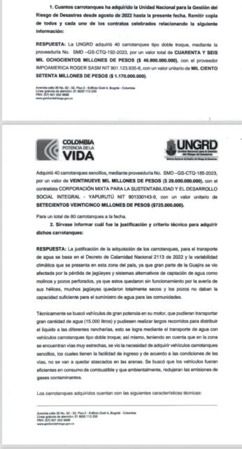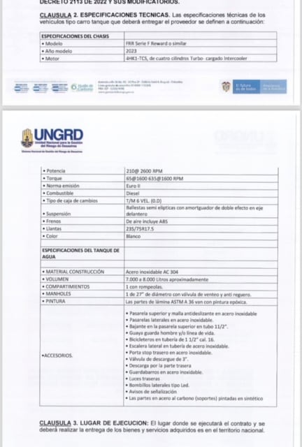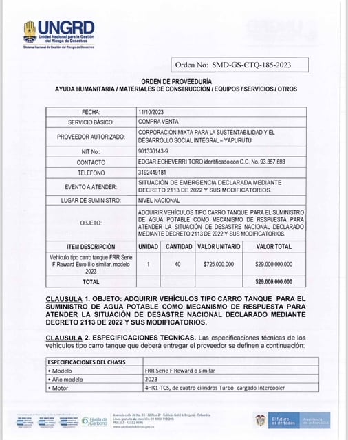 Forero explica que la empresa que fue creada en 2019 antes de este proyecto con la Unidad Nacional Para la Gestión del Riesgo (UNGRD) no había recibido un contrato similar: “es el contrato más grande que han realizado y no ha llevado a cabo servicios relacionados a la venta de camiones o carrotanques”.