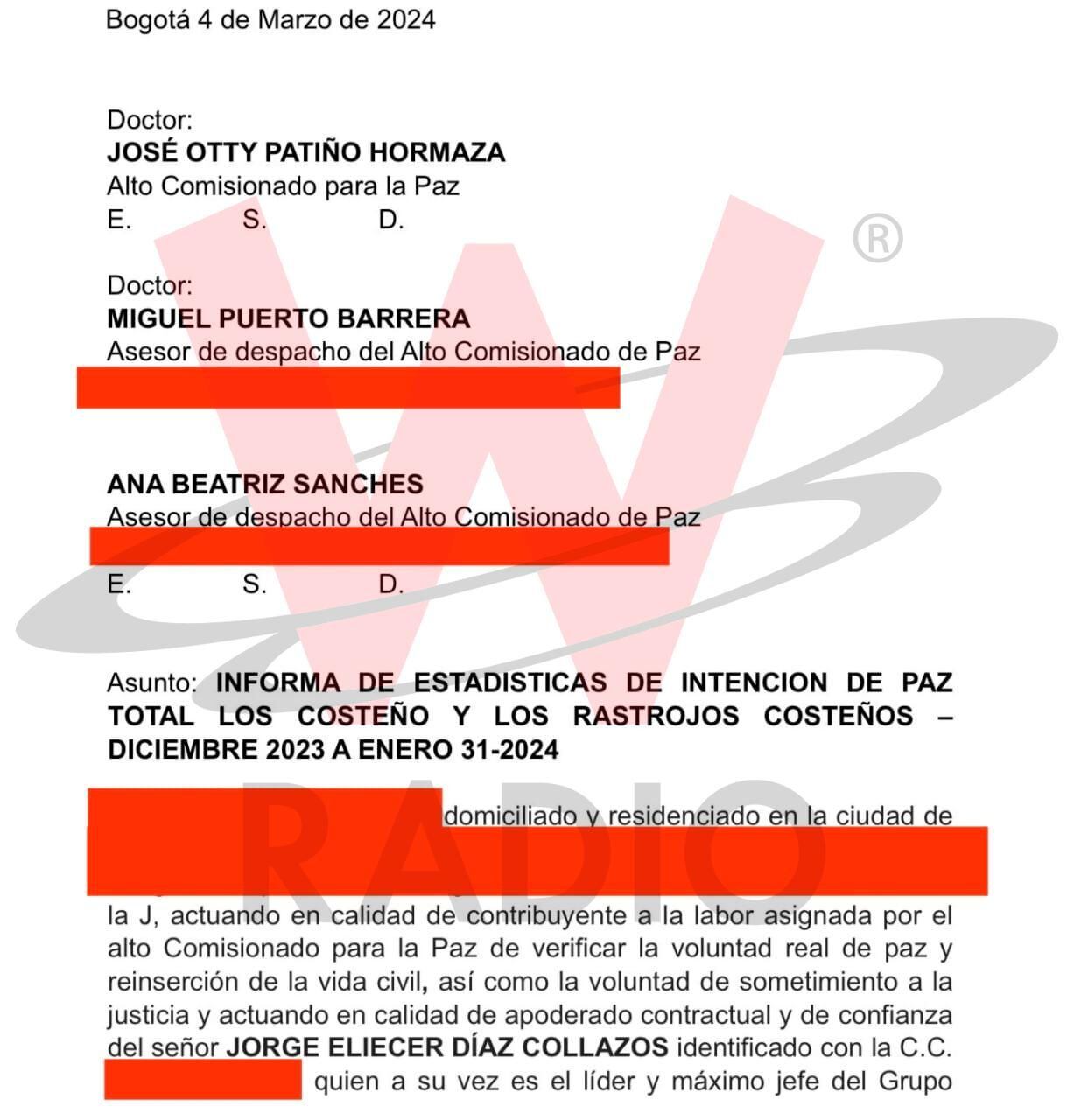 WRadio conoció el documento enviado a la Oficina del Alto Comisionado para la Paz, por Jorge Eliecer Díaz Collazos alias ‘Castor’, jefe del grupo criminal.