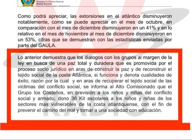 WRadio conoció la carta enviada al Alto Comisionado para la Paz, por parte de la defensa jurídica de Jorge Eliecer Díaz Collazos alias ‘Castor’, jefe del grupo criminal ‘Los Costeños’, en la que confirmó la entrega de kits escolares a niños en el municipio de Soledad, Atlántico, hechos que también fueron revelados en este medio.