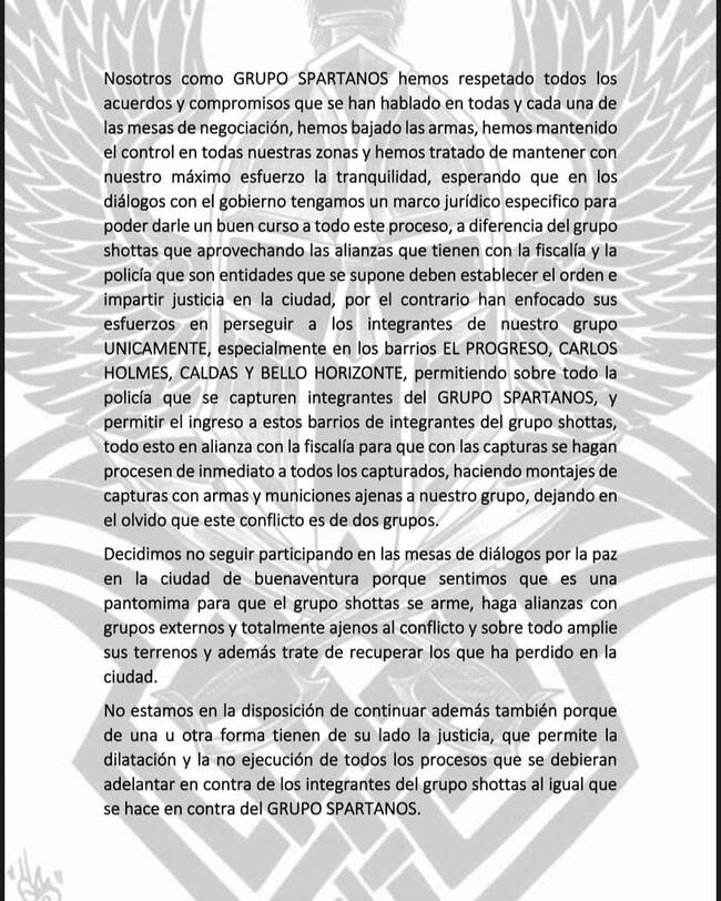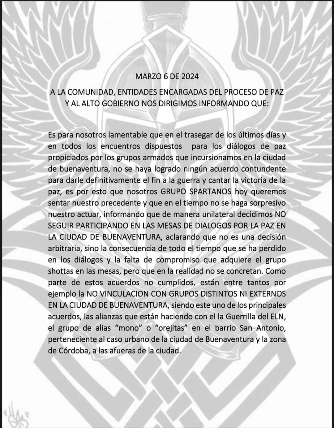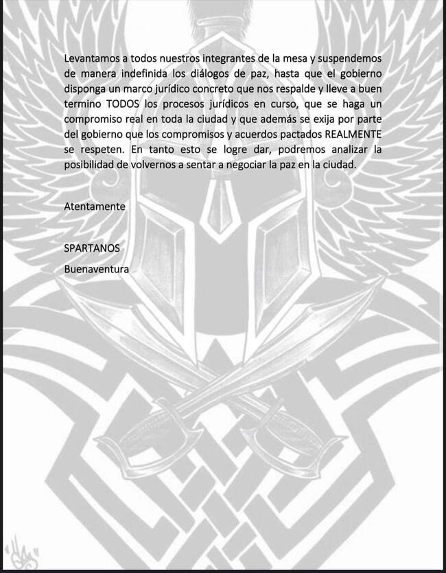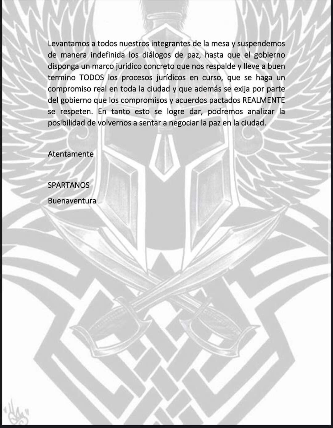 El grupo delincuencial ‘Los Espartanos’ de Buenaventura anunció que se levantan de la mesa de diálogo de paz con ‘Los Shottas’, alegando incumplimiento del Gobierno Nacional en la implementación de la Ley de Sometimiento.