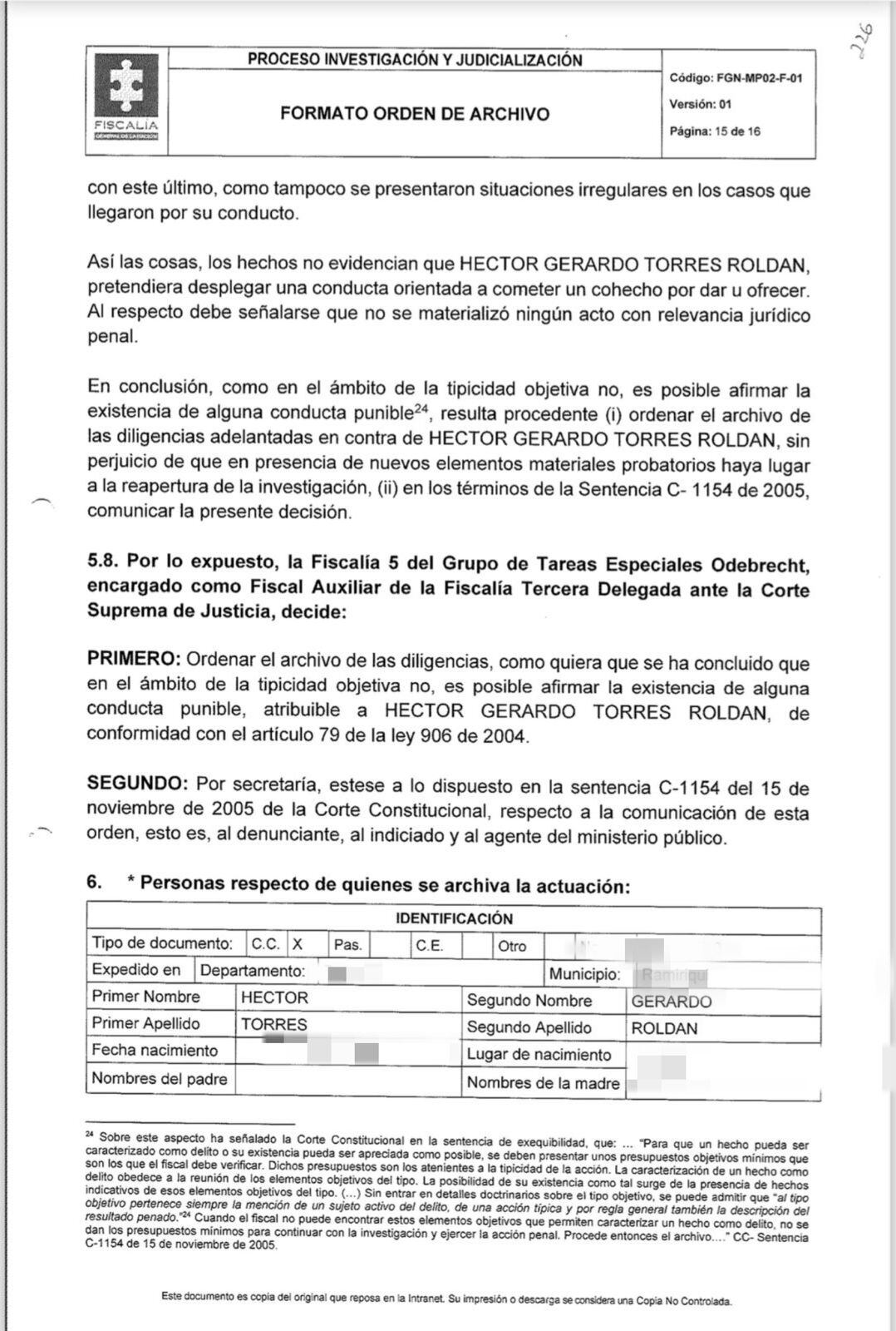 4. Como si fuera poco a Gerardo Torres, Yayo, le archivaron el proceso. El documento que ustedes pueden ver ya señala que la decisión es “Ordenar el archivo de las diligencias, como quiera que se ha concluido que en el ámbito de la tipicidad objetiva no es posible afirmar la existencia de alguna conducta punible atribuible a él”.