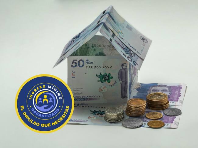 Dinero colombiano formando una casa. En el círculo, el logo de Ingreso Mínimo Garantizado (Fotos vía GettyImages y redes sociales)