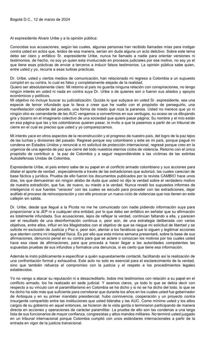 Pero además, en duros términos le dijo a Uribe que “ya todo lo que se debía decir con respecto a su vínculo con el paramilitarismo en Colombia se ha dicho y si no se ha dicho del todo, lo que se ha dicho ha sido más que suficiente para corroborar que durante los años en los cuales usted fue gobernador de Antioquia y en su primer mandato presidencial, hubo connivencia, cooperación y un proyecto contrainsurgente compartido entre las instituciones que usted lideraba y las AUC”.