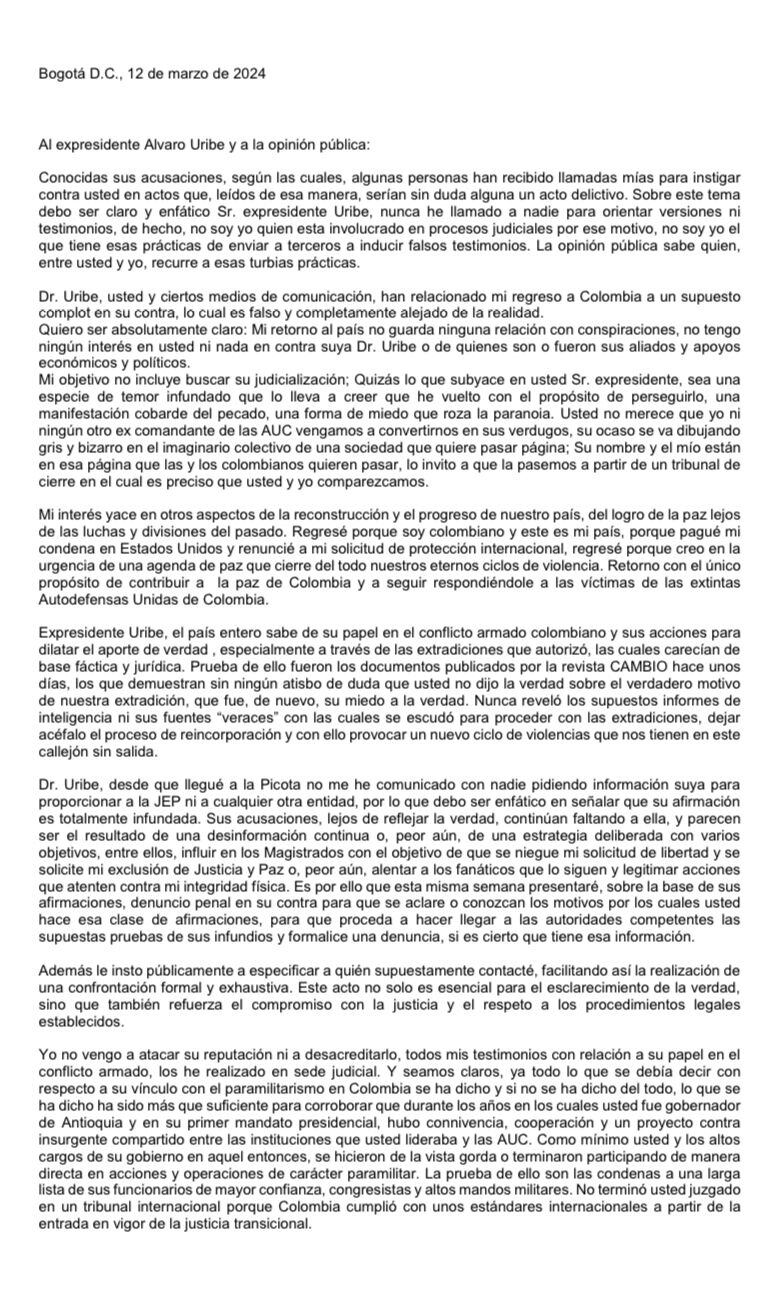 De acuerdo con el excomandante paramilitar no llegó al país de nuevo para perseguirlo: “Quizás lo que subyace en usted Sr. expresidente, sea una especie de temor infundado que lo lleva a creer que he vuelto con el propósito de perseguirlo, una manifestación cobarde del pecado, una forma de miedo que roza la paranoia”.