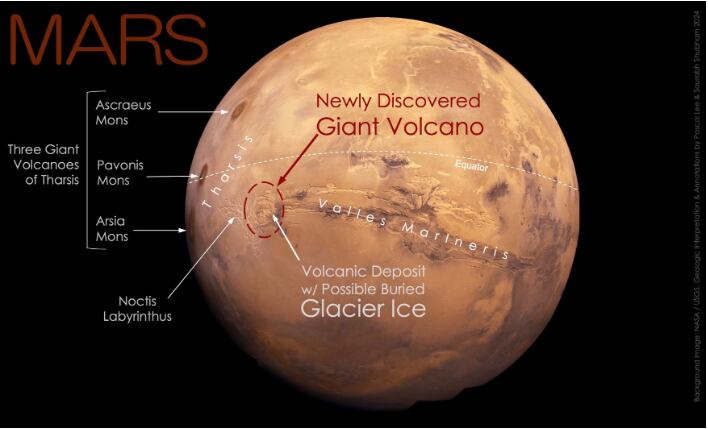 Volcán gigante escondido a plena vista en el planeta Marte. (Credito: Background image: NASA/USGS Mars globe. Geologic interpretation and annotations by Pascal Lee and Sourabh Shubham 2024).