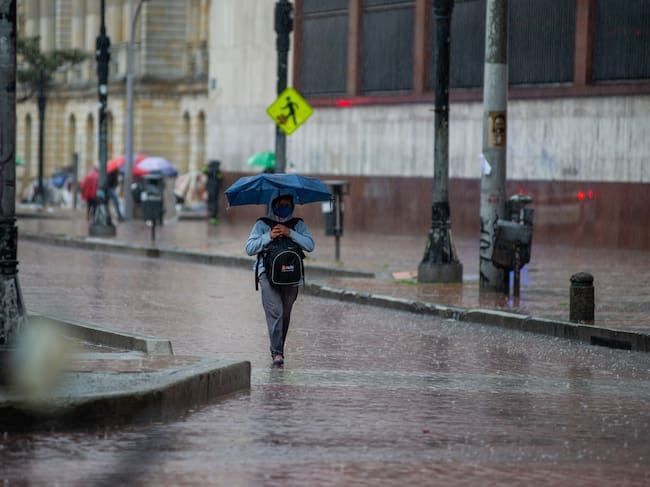Mujer caminando bajo la lluvia en Bogotá (Foto vía GettyImages) / NurPhoto