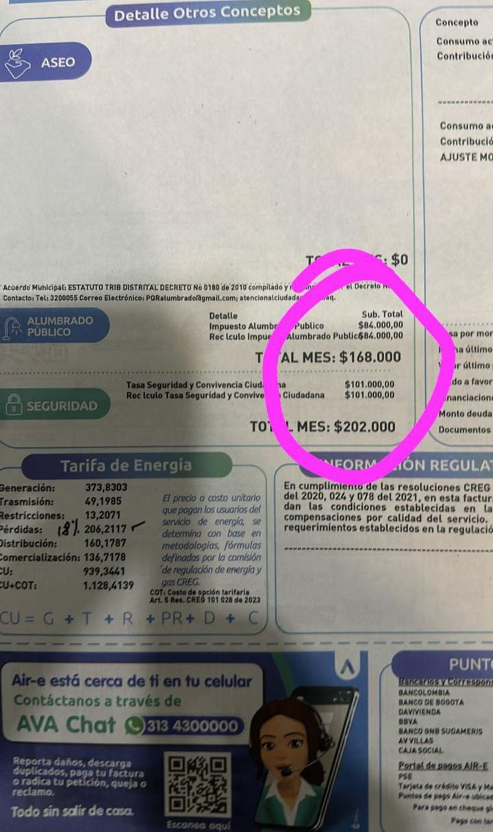 Usuarios han denunciado duplicidad en los cobros de los impuestos de Alumbrado Público y Seguridad en las facturas emitidas por la empresa de energía Air-e.