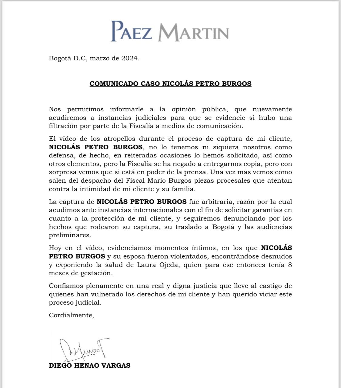 También reiteró que la “captura de NICOLÁS PETRO BURGOS fue arbitraria, razón por la cual acudimos ante instancias internacionales con el fin de solicitar garantías en cuanto a la protección de mi cliente, y seguiremos denunciando por los hechos que rodearon su captura, su traslado a Bogotá y las audiencias preliminares”.