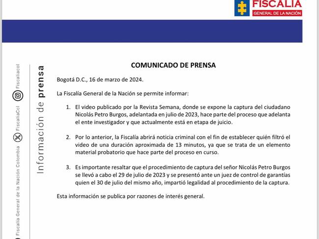 La Fiscalía General de la Nación anunció su abrirá una noticia criminal para investigar y establecer quién filtró el video de la captura de Nicolás Petro Burgos, hijo del presidente de la República Gustavo Petro.