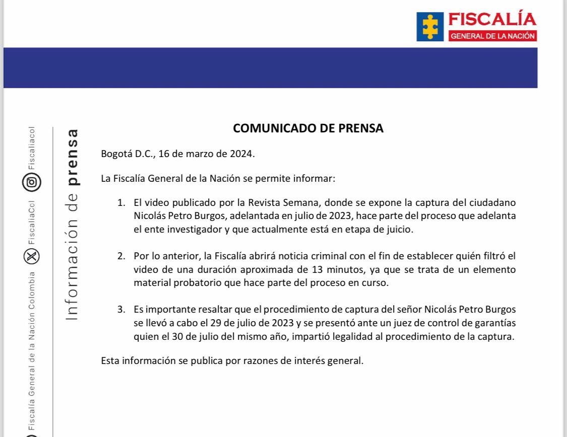La Fiscalía General de la Nación anunció su abrirá una noticia criminal para investigar y establecer quién filtró el video de la captura de Nicolás Petro Burgos, hijo del presidente de la República Gustavo Petro.