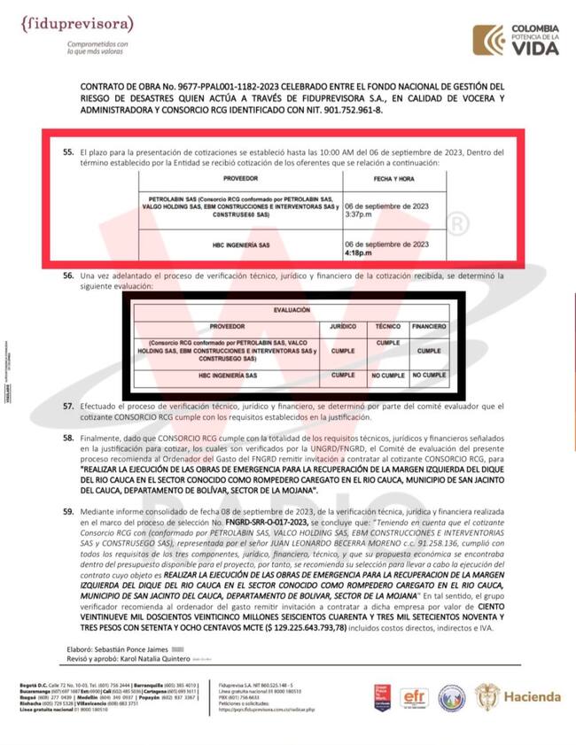 El viernes 1 de septiembre de 2023 la UNGRD envió una solicitud de cotización a tres proveedores potenciales: el primero, al Consorcio RCG conformado por las empresas Petrolabin SAS, Valco Holding SAS, EBM Construcciones e Interventorías SAS y Construsego SAS; el segundo proveedor, HBC Ingeniería SAS y el tercero, Constructora Ozul SAS.