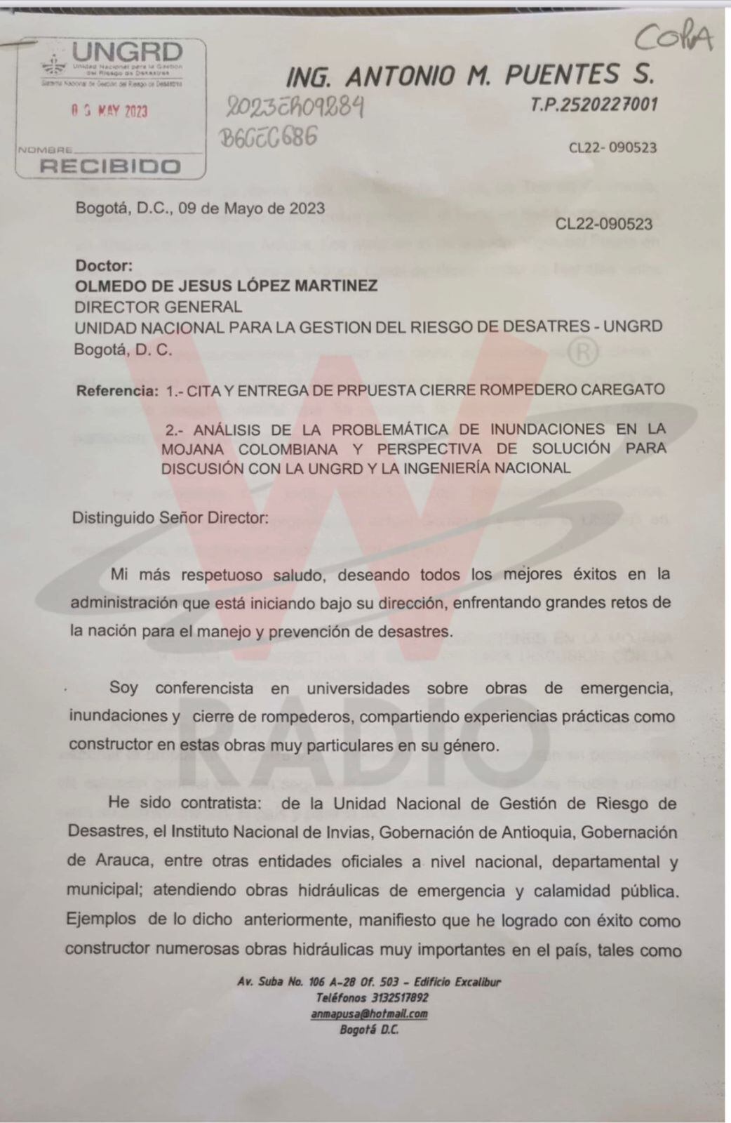 El ingeniero Antonio Puentes, en carta enviada en mayo de 2023 al entonces director de la UNGRD, Olmedo López, le indicó que las obras se podrían realizar con recursos por cerca de $77 millones, pero que nunca se tuvo en cuenta su propuesta.
