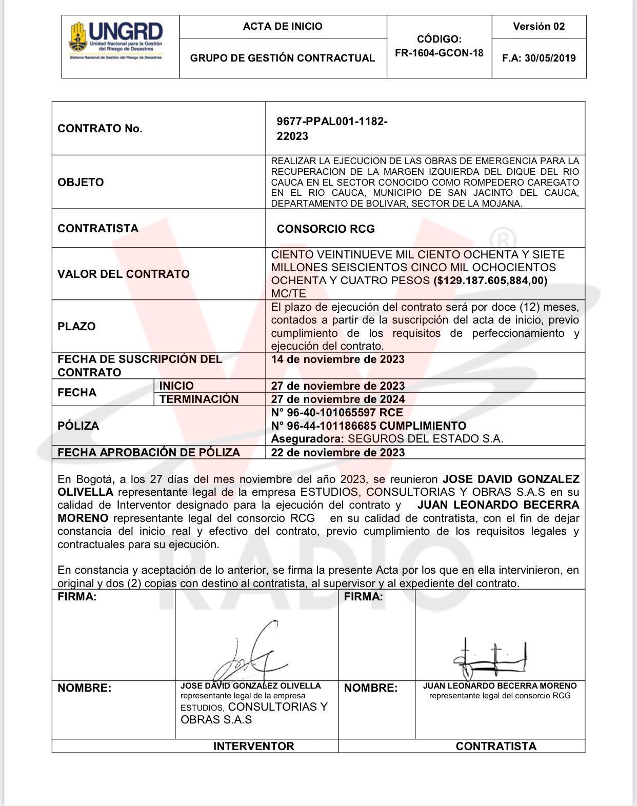 “Teniendo en cuenta la recomendación del comité de verificación, el director general de la Unidad Nacional para la Gestión del Riesgo de Desastres (UNGRD) y ordenador del gasto del Fondo Nacional de Gestión del Riesgo de Desastres (FNGRD) el dr. OLMEDO DE JESÚS LÓPEZ MARTÍNEZ, remite el 08 de septiembre de 2023, invitación a contratar al CONSORCIO RCG, identificado con el Nit. 901752961-8, cuyo representante legal es JUAN LEONARDO BECERRA MORENO”, y ese mismo día se contestó y se aceptó la invitación a contratar.
