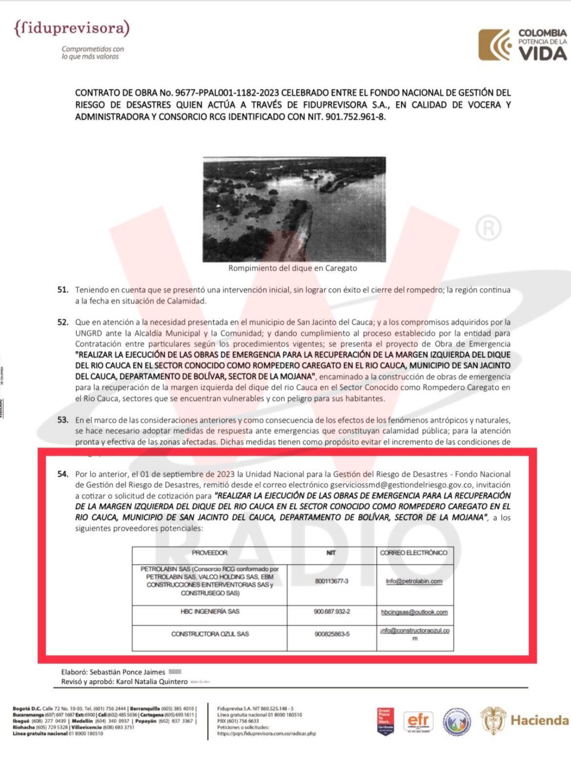El viernes 1 de septiembre de 2023 la UNGRD envió una solicitud de cotización a tres proveedores potenciales: el primero, al Consorcio RCG conformado por las empresas Petrolabin SAS, Valco Holding SAS, EBM Construcciones e Interventorías SAS y Construsego SAS; el segundo proveedor, HBC Ingeniería SAS y el tercero, Constructora Ozul SAS.
