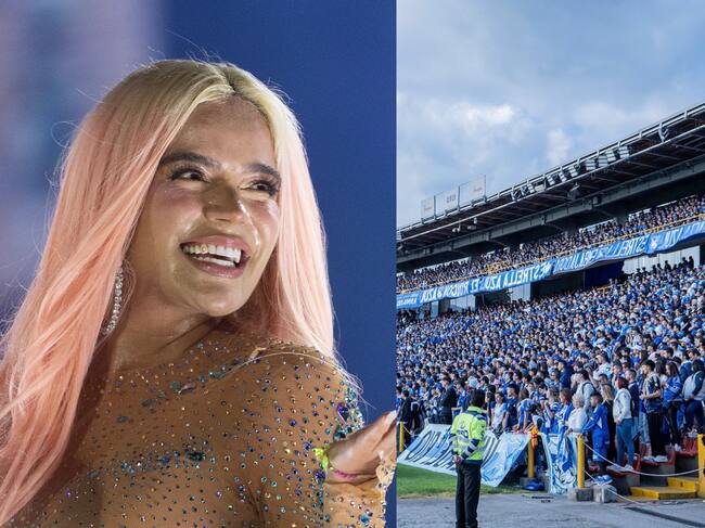 Collage Karol G, hinchada de Millonarios FC. Fotos: Efe, X @MillosFCoficial
