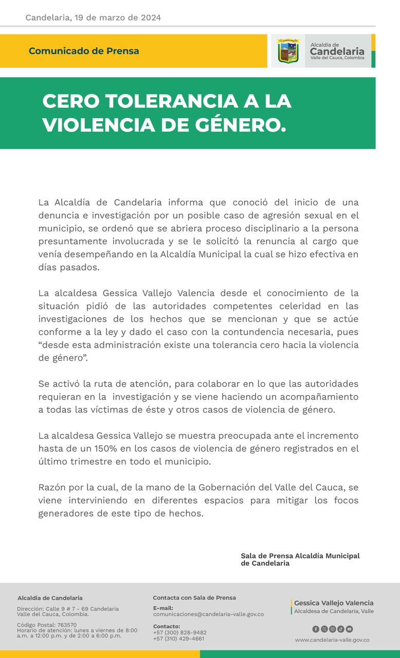 Sin embargo, en un comunicado reciente, la mandataria anunció la apertura de un proceso disciplinario al funcionario implicado y le solicitó su renuncia al cargo. Además, indicó que se activó la ruta de atención a la víctima.
