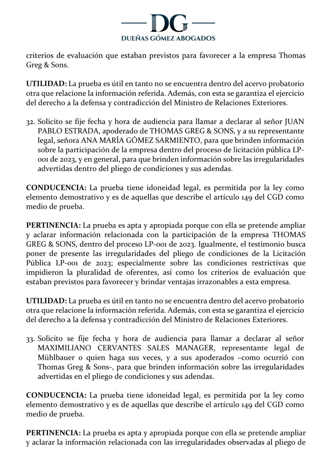 “La prueba es apta y apropiada porque con ella se pretende ampliar y aclarar información relacionada con la participación de la empresa THOMAS GREG & SONS, dentro del proceso LP-001 de 2023. Igualmente, el testimonio busca poner de presente las irregularidades del pliego de condiciones de la Licitación Pública LP-001 de 2023; especialmente sobre las condiciones restrictivas que impidieron la pluralidad de oferentes, así como los criterios de evaluación que estaban previstos para favorecer y brindar ventajas irrazonables a esta empresa”, dice el oficio de descargos acerca del testimonio de Juan Pablo Estrada.