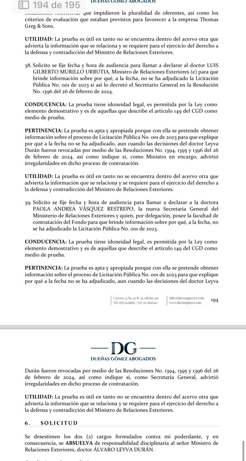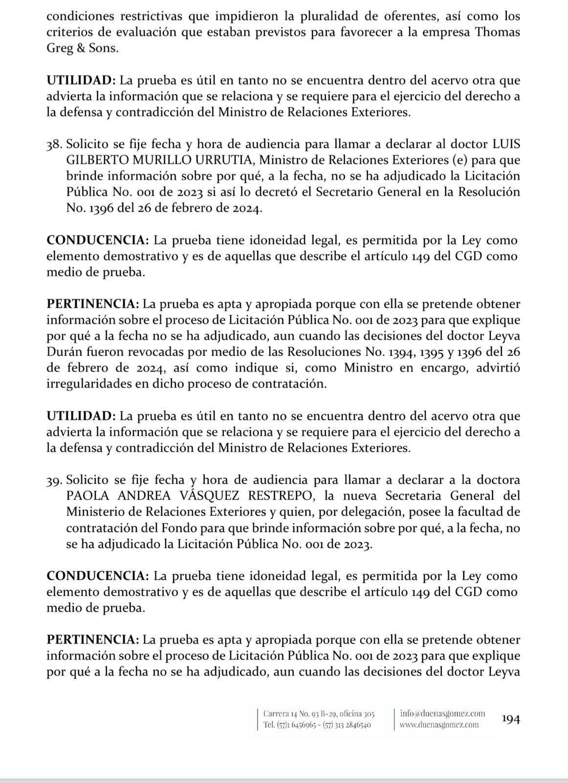 “La prueba es apta y apropiada porque con ella se pretende obtener información sobre el proceso de licitación pública No. 001 de 2023 para que explique por qué a la fecha no se ha adjudicado, aun cuando las decisiones del doctor Leyva Durán fueron revocadas por medio de las Resoluciones No. 1394, 1395 y 1396 del 26 de febrero de 2024, así como indique si, como ministro en encargo, advirtió irregularidades en dicho proceso de contratación”, señala el documento.