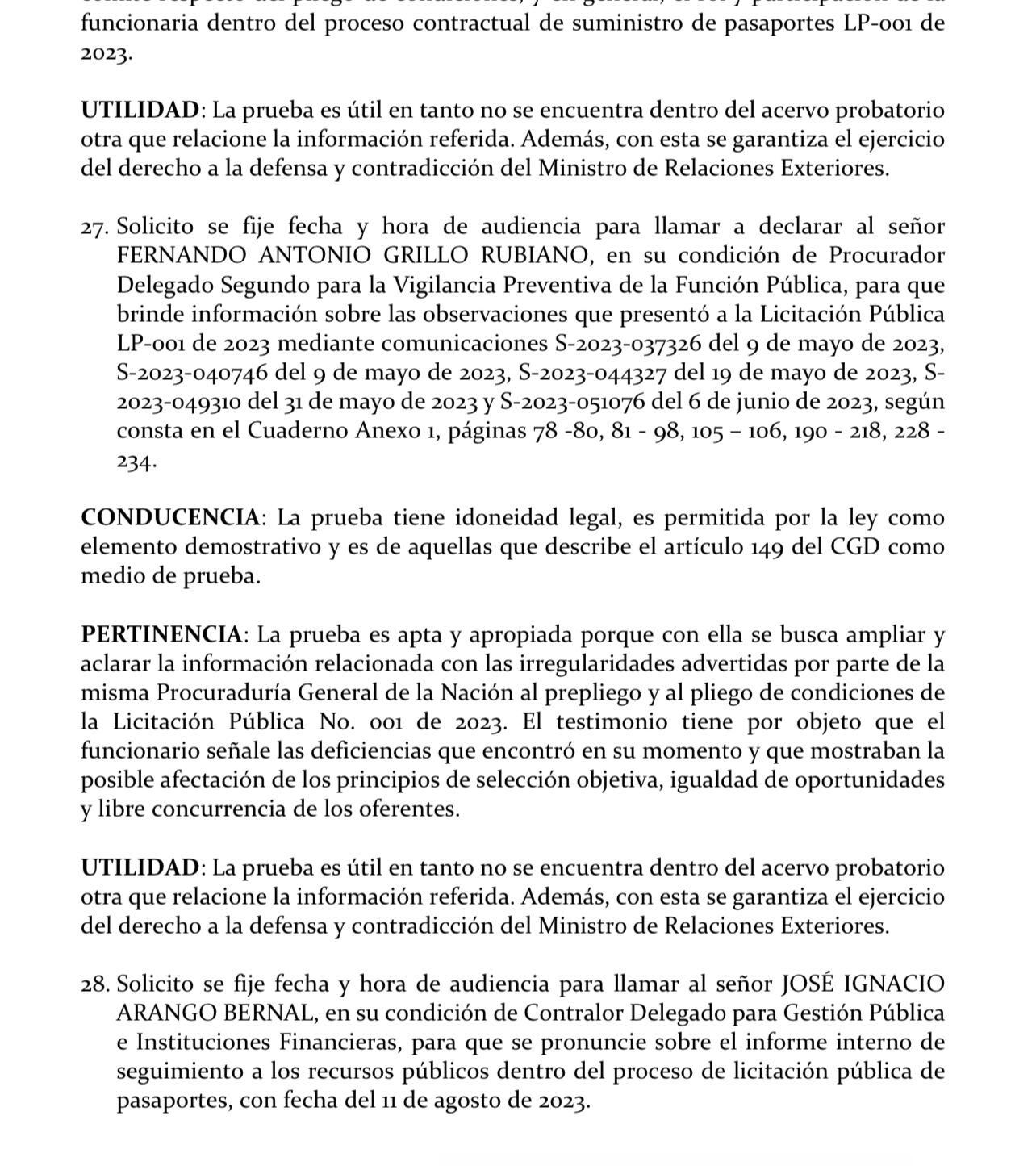 En el caso del canciller (e) Luis Gilberto Murillo, el oficio sostiene que es importante establecer los detalles de la licitación pública No. 001 de 2023: