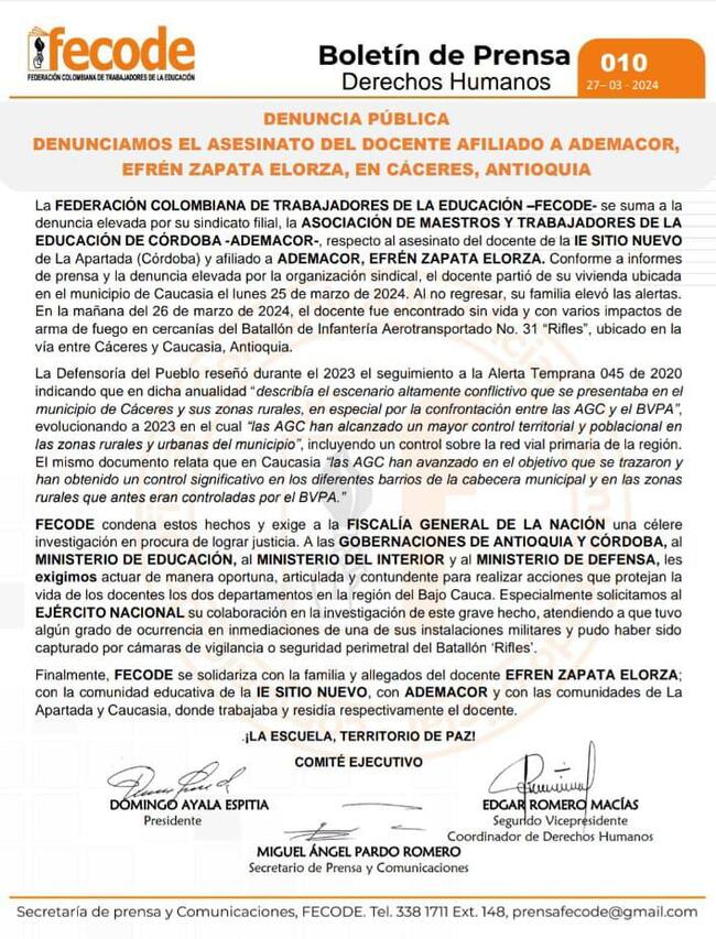 “Según fuentes extraoficiales, efectivos de la policía encontraron en la mañana del martes 26 de marzo en la vía Caucasia - Cáceres, a la altura del Batallón Rifles, el cuerpo del educador, quien presentaba varios impactos de bala”, agregó Ademacor.