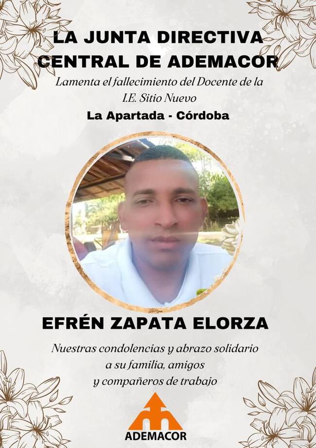 Sobre lo ocurrido, la Junta Directiva Central de la Asociación de Maestros de Córdoba (Ademacor), sostuvo que “ante este nuevo hecho de sangre contra el magisterio cordobés; la organización sindical hace el llamado vehemente a las autoridades competentes para que esclarezcan este lamentable suceso que hoy enluta al gremio docente, y exige que se castiguen a los responsables para que este crimen no quede impune”.