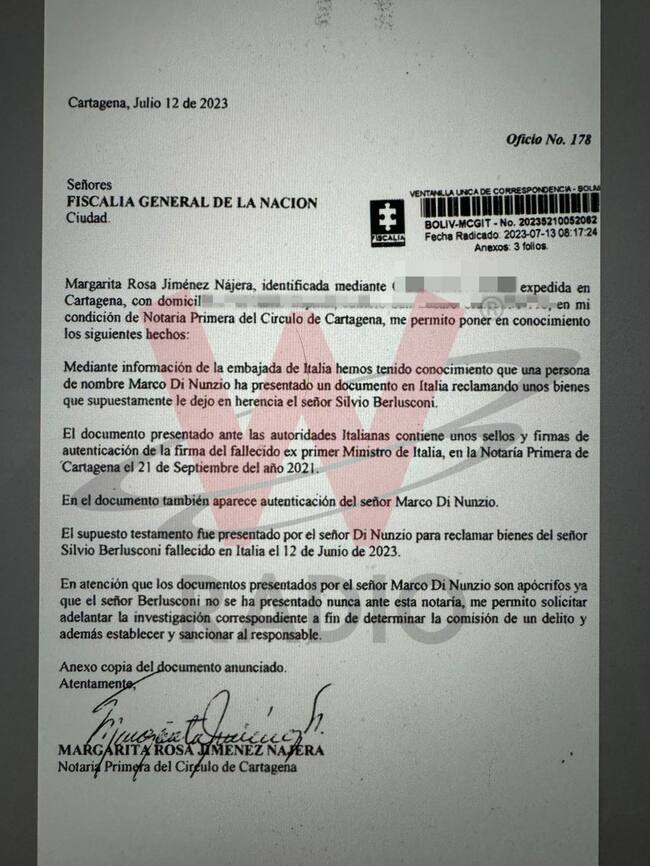 La notaria que lo firma es la doctora Margarita Rosa Jiménez Nájera quien le envió una carta a la Fiscalía General de la Nación en Colombia diciendo: “los documentos presentados por el señor Marco Di Nunzio son apócrifos ya que el señor Berlusconi no se ha presentado nunca en esta notaría, me permito solicitar adelantar la investigación correspondiente a fin de determinar la comisión de un delito”.