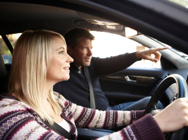 Pareja dentro de un vehículo en Reino Unido conduciendo por la izquierda (Foto vía GettyImages) / Image Source