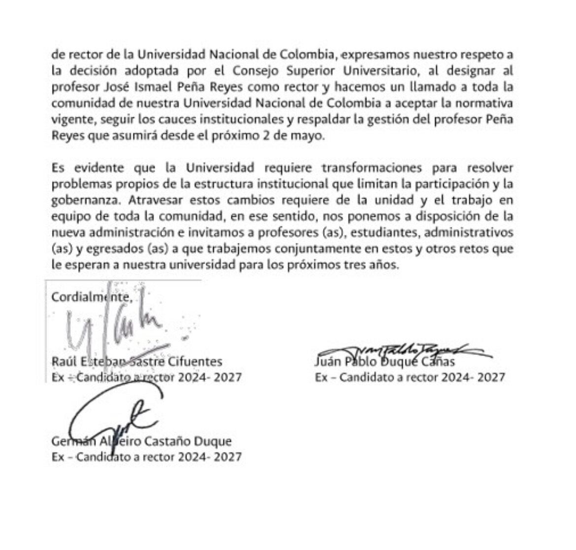 Raúl Esteban Sastre, Juan Pablo Duque Cañas y Germán Albeiro Castaño, quienes compitieron por la rectoría, expresaron su respeto por la elección de Peña a través de una carta pública. En ella, enfatizan la importancia de aceptar la normativa vigente y respaldar la gestión del nuevo rector, que comenzará el 2 de mayo.