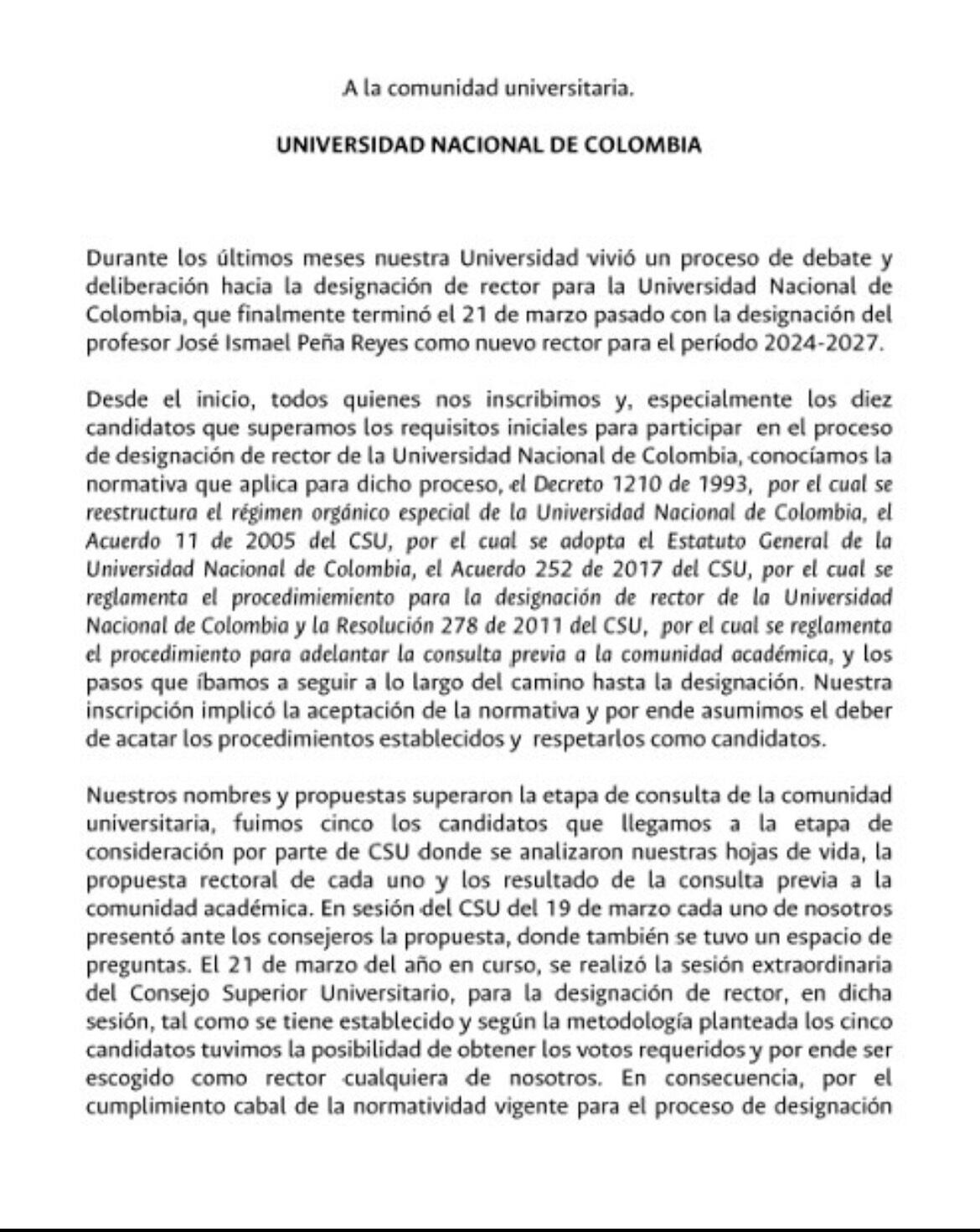 Tres excandidatos a la rectoría de la Universidad Nacional de Colombia han emitido una declaración respaldando la designación de José Ismael Peña como nuevo rector e instando a la comunidad universitaria a trabajar unida para abordar los desafíos institucionales.
