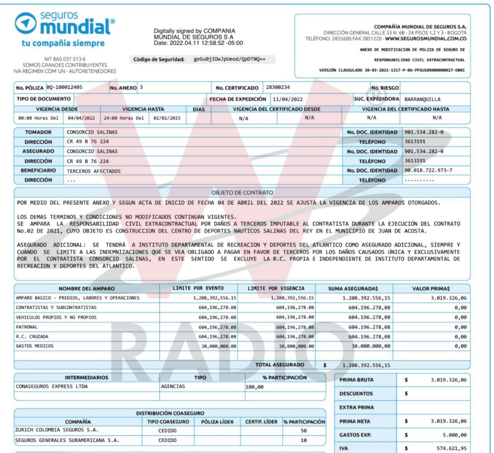 Por otra parte, en documentos evidenciados en el Secop no hay registro de la renovación de la póliza de seguro de responsabilidad civil extracontractual, tomada por el Consorcio Salinas y que venció el 2 de febrero del 2023.
