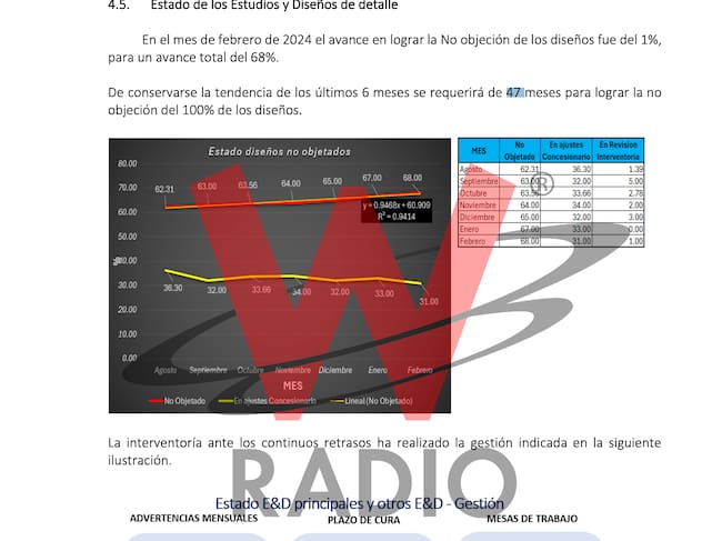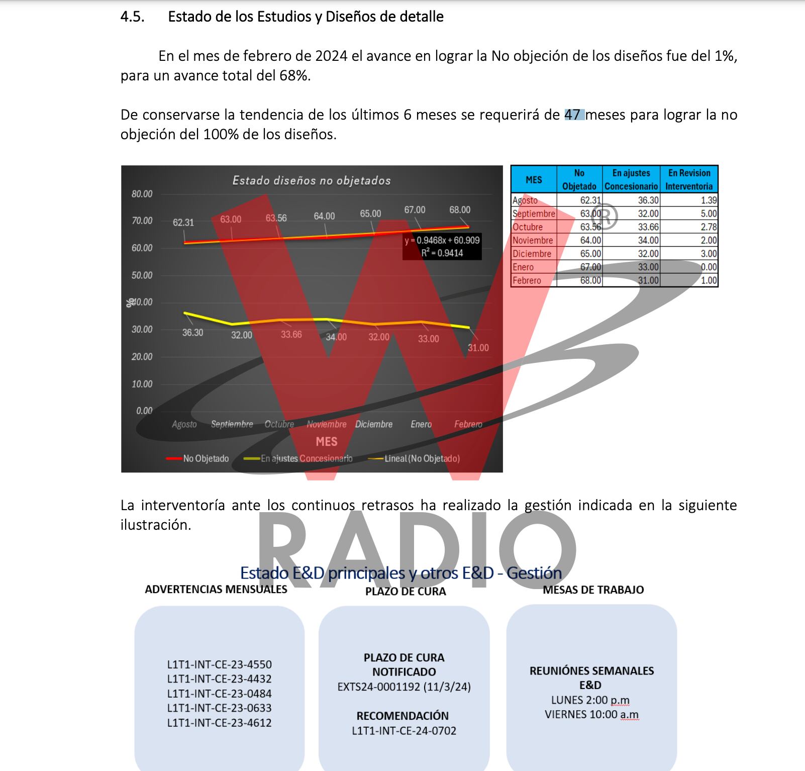 La interventoría advirtió que si se mantiene la tendencia de trabajo de los últimos seis meses, se requerirían 47 meses adicionales para culminar el 100% de los diseños, es decir, cerca de cuatro años.