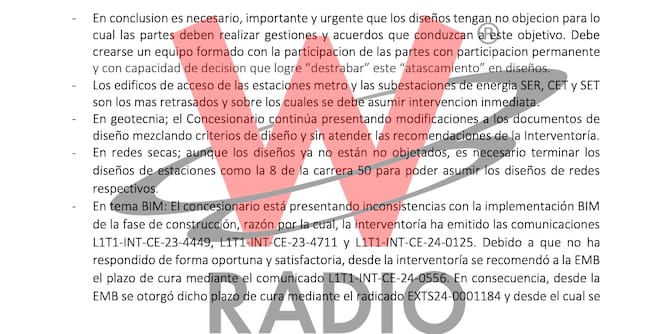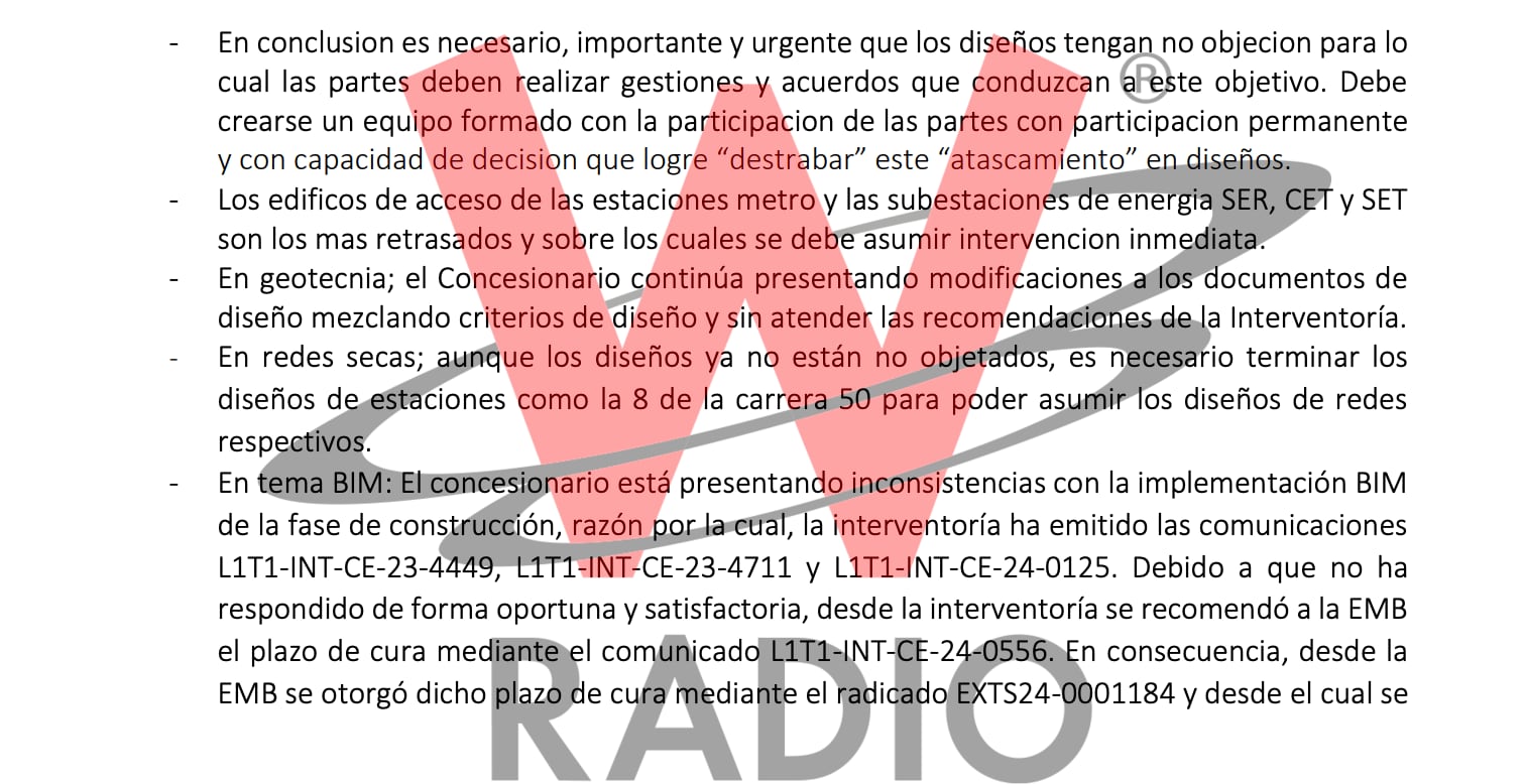 El informe resalta que los edificios de acceso a las estaciones del metro y las subestaciones de energía son las estructuras que enfrentan mayores retrasos, requiriendo una intervención inmediata. En cuanto a la geotecnia, el concesionario sigue realizando modificaciones a los documentos de diseño, ignorando las recomendaciones de la interventoría.