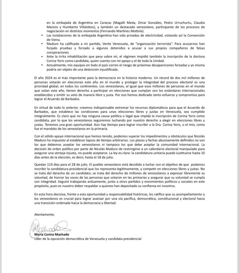 “Actualmente, mis equipos en todo el país corren el riesgo de próximas desapariciones forzadas y yo misma podría ser objeto de una detención injustificada”, escribió en la carta en la que también relata cómo se impidió la inscripción de Corina Yoris como candidata sustituta durante el periodo de postulaciones que activó el Consejo Nacional Electoral (CNE) entre el 21 y el 25 de marzo.