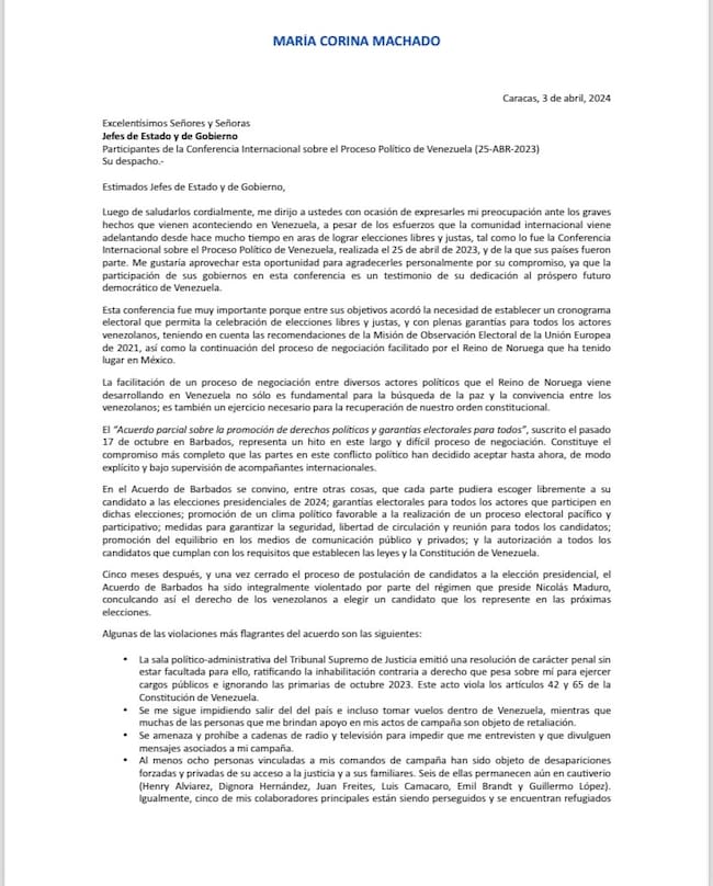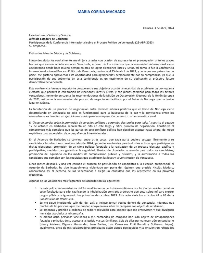 Luego de enviar una carta al Reino de Noruega, María Corina Machado, candidata electa en las primarias opositoras con más de dos millones de votos, pero inhabilitada para participar en las elecciones presidenciales del 28 de julio, hizo lo propio enviando cartas a 18 Jefes de Estado de los países que participaron en la Conferencia Internacional sobre Venezuela realizada en Bogotá en abril del 2023.
