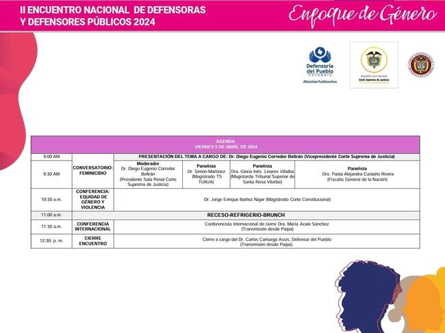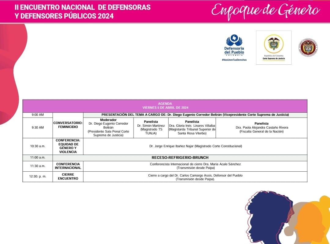 Esta es la agenda que se desarrollará este viernes 5 de abril en el Centro de Convenciones del Hotel Estelar de Paipa en el Segundo Encuentro de Defensoras y Defensores Públicos del país.