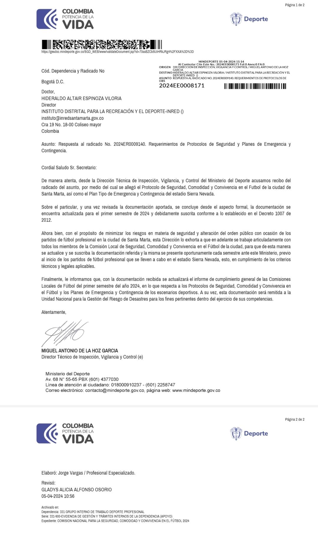 Luego de conocerse el cierre al público de las tribunas del estadio Sierra Nevada; el Instituto Distrital para la Recreación y el Deporte de Santa Marta, Inred, a través de un comunicado se refirió al respecto asegurando que se logró actualizar la documentación requerida y enviarla al Ministerio del Deporte.