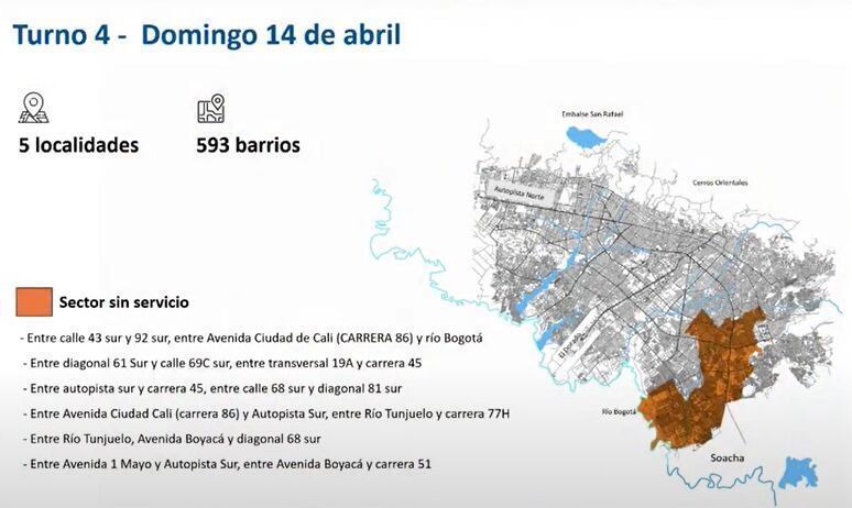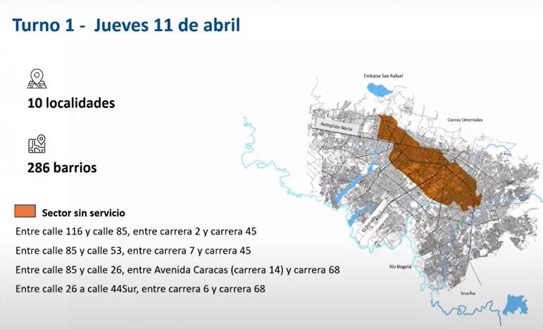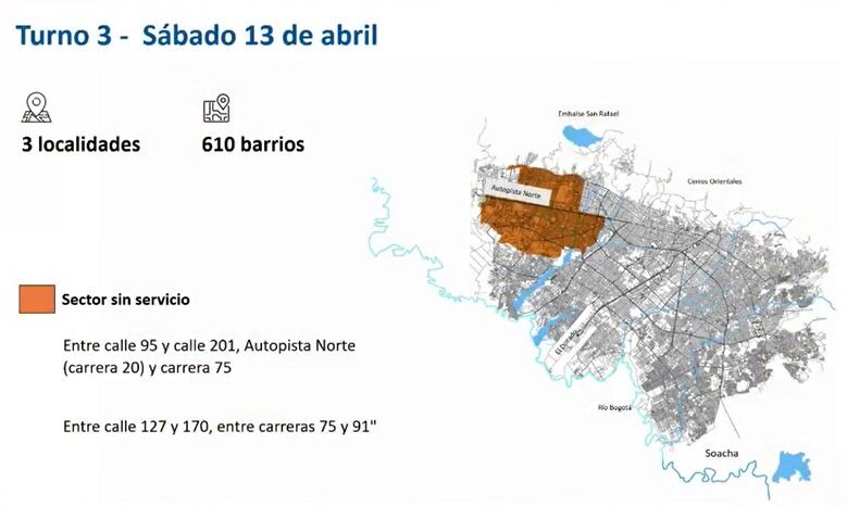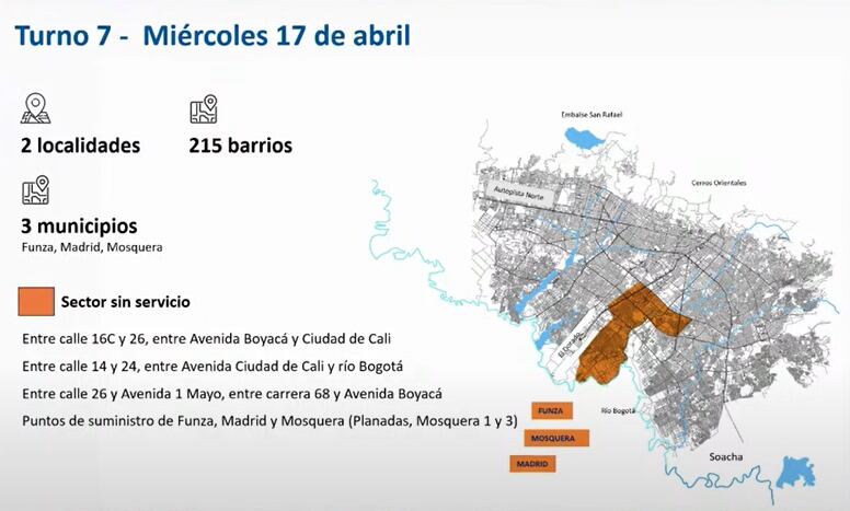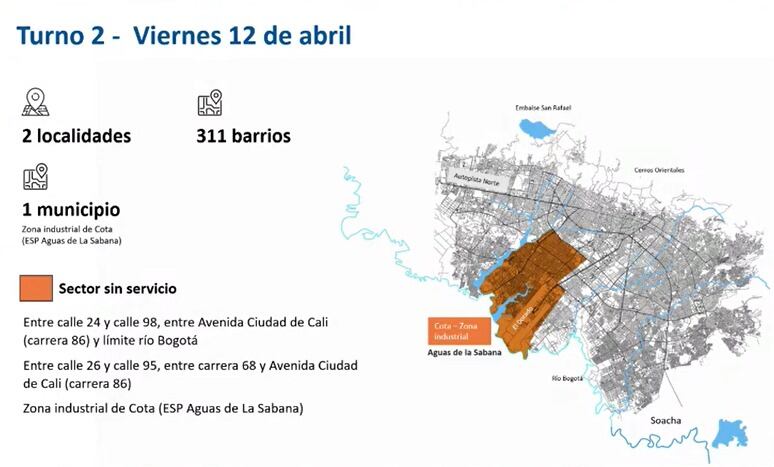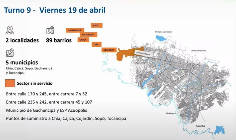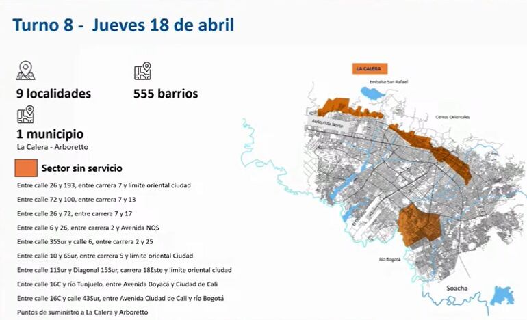 - Chía, Cajica, Sopó, Gachanchipa, Tocancipá: En Bogotá, será entre calle 170 y 245, entre carrera 7 y 52; Entre calle 235 y 242, entre carrera 45 y 107. Además, será en los municipios de Gachancipá y ESP Acuopolis; Puntos de suministro a Chía, Cajicá, Cojardín, Sopó, Tocancipá.