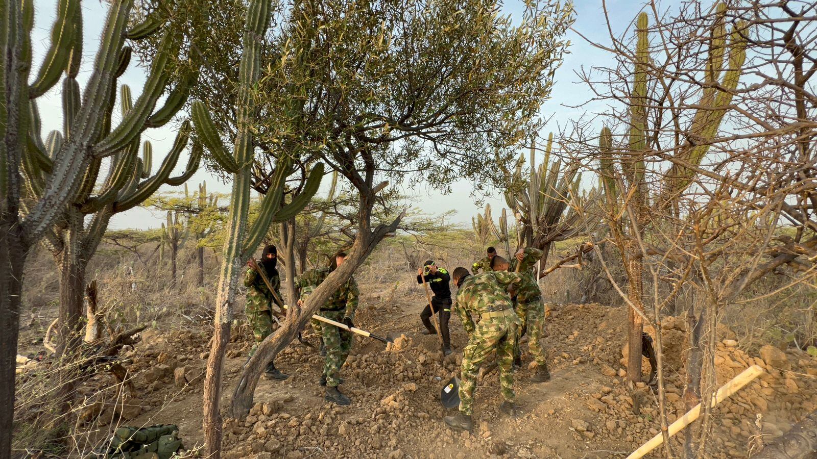Con coordenadas precisas, las fuerzas combinadas llegaron hasta un paraje solitario del Cerro de La Teta, en zona rural de Uribia (La Guajira) y comenzaron a cavar la tierra hasta encontrar 40 lonas, cada una con 25 panelas.