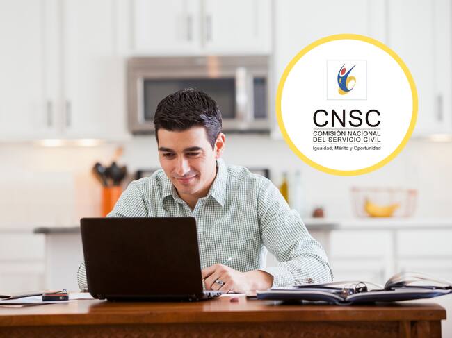 Hombre usando su computador para hacer diferentes consultas. En el círculo, logo de la Comisión Nacional del Servicio Civil (Fotos vía GettyImages y redes sociales)
