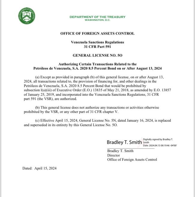 Paralelamente, el gobierno estadounidense emitió este lunes, 15 de abril, una extensión de los llamados “Bonos 2020″ de Pdvsa hasta el 13 de agosto de este año.